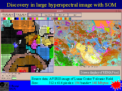 Clusters identified from a knowledge representation display of a 40 x 40 Self-Organizing Map (left), and the corresponding spatial regions (right). The input data set is the same 194-band, 140 Mbyte AVIRIS spectral image as in slide 6. The full spectral resolution was utilized in producing these 32 clusters, in an unsupervised procedure. Screen display is from the graphical user interface of the REMAP tool. Image material from Merényi et al, 1999c.