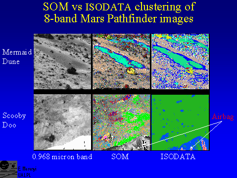 Even for lower dimensionality, such as this IMP, Mars Pathfinder image, there are advantages in using SOMs. ISODATA and SOM clustering are shown for two IMP spectral images. The left panels are 0.968 micron band images, to show scene details.The upper row is the ``Mermaid Dune", for which SOM (middle)and ISODATA (right) detected similar clusters. Note, however, that the detail in the SOM is higher. The lower row is an ``unusual" case, and illustrates how robust algorithms can be useful for such situations. The area is that near the rock ``Scooby Doo", very close to the lander unit. Visible at the bottom is the airbag sticking out from underneath the lander. (In the 0.968 micron grey scale image the airbag is extremely bright because the scene had to be brightened in order to see the details of rocks and soils. The SOM clustered imge shows the original appearance of the airbag.) This material (a ``noise" for us) is drastically different from the surrounding geologic surfaces (our interest) and there are many shade variations within it. ISODATA assigned most of the 64 allotted clusters to the airbag. Only after requesting more than 64 clusters, started meaningful distinctions appear within the area containing rocks and soil. The SOM clustering and visualization captured the important distinctions at once.
