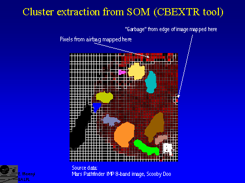 The pixels coming from the airbag were strongly separated and far away from all geologic materials. The same is true for some "garbage" at image edge.The empty black patch toward the lower left contained one neuron onto which all pixels from some weird noise in several lines at the bottom of the image were mapped. (Different from the "garbage" indicated above.) That cell was so bright that it set off the scaling for all others, so I simply deleted it for display purposes. But it again demonstrates how smart the SOM is.