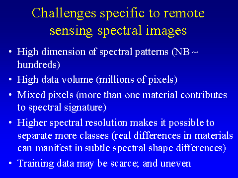 Spectral signatures of materials are resolved well enough by hyperspectral sensors to recognize narrow absorbtion bands measured in the laboratory. Based on specific bands and band shapes, the mineralogy can be identified. Broad band multi-spectral sensors do not provide that capability. But hyperspectral data are huge: an AVIRIS (224 bands) image is more than 30 times larger than a Landsat TM image of the same spatial size.
