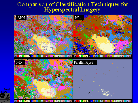The ANN classifier is an SOM-hybrid (described in Merémyi et al., 1997, Howell et al., 1994): the SOM component forms clusters in an unsupervised regime before the actual supervised classification begins. This helps prevent learning inconsistent information; enables better generalization from small number of training samples (a REAL problem in remote sensing!), which results in more accurate classification. Selection of correct training samples is also important. We developed a related integrated interactive tool under this AISRP project (EXPLORE, different from tools available in popular packages) to aid in that. The advantage of ANN over the other classifiers increases with increasing spectral dimensionality. (ML can do good job for, e.g., Landsat TM = 6 bands, since 6+1 = 7 training samples per class - required for ML to avoid singular covariance matrix - are not difficult to find. Identifying >200 training samples per class for the above 23 classes, however, can be prohibitively labor intensive, or impossible for very small classes.)
