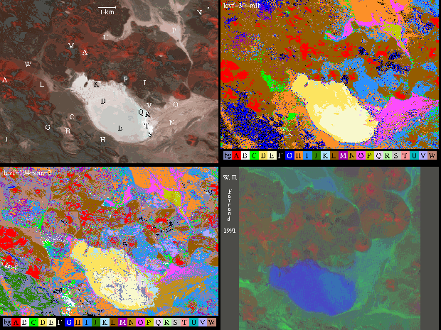 (Click on image for full size.) Upper left: Color composite of the Lunar Crater Volcanic Field (LCVF), Nevada, from a 1994 AVIRIS image. The labels indicate distinct surface units where training pixels were extracted. Cinder cones (red features, A), young (F) and old (I) basalt flows , iron oxide rich soils (L, W), a small rhyolite outcrop (B), and a narrow strip of tuff exposed along a scarp (G) are among the tertiary volcanic products in the area. The dry Lunar Lake playa contains two large compositionally distiguishable parts (D and E), and several small units (Q, R, S, T) at its northern outflow area. Sediment transport is indicated in the long, downsloping outflow channels with varied water and clay contents (N, O, P, U). The basalt cobbles strewn around the edge of the playa (K) have a characteristic, albeit subtle distinction in their spectra (which is a mix of playa and basalt signature), which allows mapping of this unit.