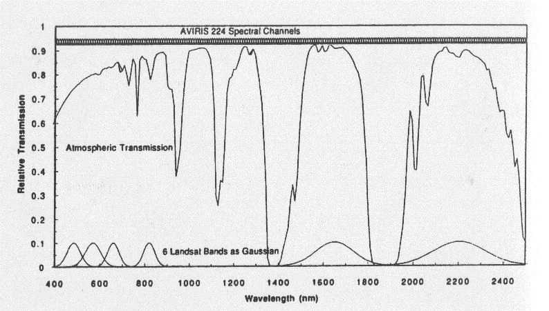 The difference between traditional broad band and hyperspectral imaging: bandpasses of Landsat TM (at bottom), and AVIRIS (top).