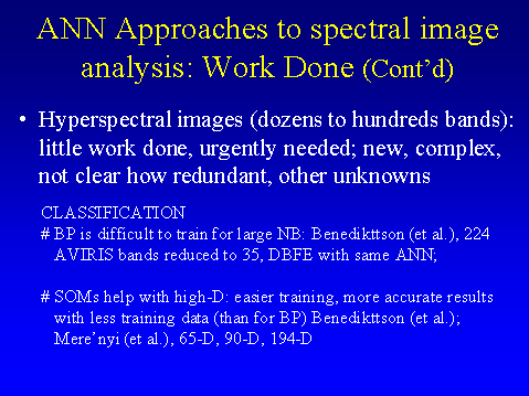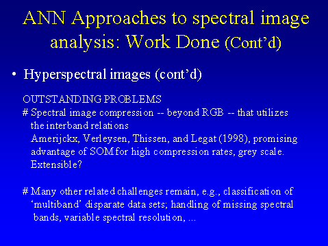 Slides of review talk " The Challenges in Spectral Image Analysis: an Introduction, and Review of ANN Approaches", introducing a special session on "Spectral Image analyses with ANNs", organized by E. Merényi, at ESANN'99, European Symposium on Artificial Neural Networks, Bruges, Belgium, April 21-23, 1999. See Paper for text and references.