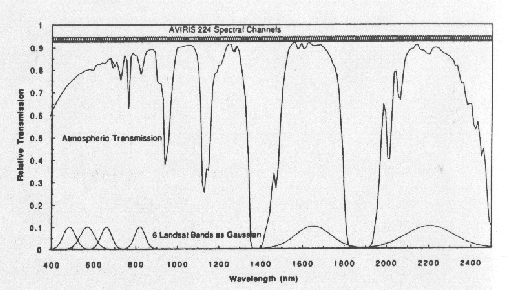 This illiustration shows the difference between the bandpasses of a broad band mutli-spectral imager, Landsat TM, and a hyperspectral scanner, AVIRIS. (Green and Simmonds, Summaries of the 4th JPL Airborne Geoscience Workshop, Pasadena, CA, 1993. R.O. Green Ed.)