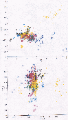 views of a 13-dimensional spectral data set of asteroids. The different colors