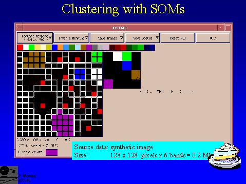 This is an example of a partial re-mapping of the clusters detected in the small, 128 x 128 pixel, 6-band synthetic image in slides 8 and 9. Note, for example, that the brown cluster was not fully covered (one SOM neuron , which does have data points mapped onto it (slide 9), was left out). The corresponding spatial area in the image shows unmapped (black) speckles. Seeing and delineating the clusters for this "toy" case is a piece of cake.