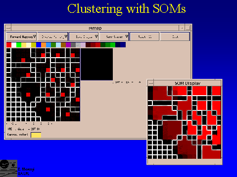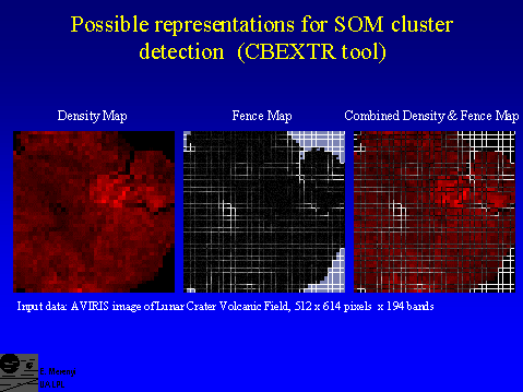 One of the crucial concerns in using SOMs is the correctness /reliability of the topological mapping from higher-D space to 2-D. With small data sets such as in our asteroid taxonomy studies (Howell et al., 1994, Merényi et al., 1997) we could examine the SOM in a semi-manual manner, and observe occasional ``entangling" of clusters: some data points became ``stuck" in one part of the SOM while they clearly belonged to some cluster that formed in another part of the SOM. Reasons for this phenomenon can be, for example, that the intrinsic dimensionality of the input space is too high for correct mapping onto a 2-D SOM; or that the SOM lattice is too small causing a boundary effect (as shown in Merényi et al. 1997). Convergence of the weights can be monitored easily; however, convergence does not equate to correctness of the clustering. While aware of the possibility of erroneous clustering, with large data sets it is very difficult, if not impossible, to detect these conditions unless many hours are spent on checking every SOM map. With small data sets that require short processing time, incorrect clustering can usually be remedied by a new run with a different random initial state, wich could produce a problem-free clustering. For large data sets, even if we notice the incorrect mapping, repeated runs are expensive. To cluster the AVIRIS image shown in slide 11., for example, takes about 24 hours on the PI's current Sun Ultra 1. (It is no consolation that ISODATA takes 2-3 days for the same image.) Leaving the long run time aside (because the same process will take mere seconds if implemented in parallel hardware), the effort needed to detect the ill conditions is still tremendous, certainly impractical.