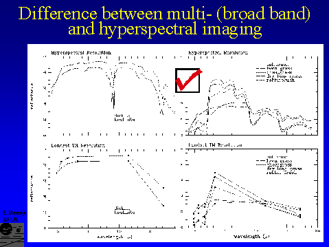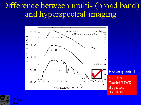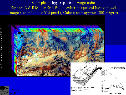Spectral signatures of materials are resolved well enough by hyperspectral sensors to recognize narrow absorbtion bands measured in the laboratory. Based on specific bands and band shapes, the mineralogy can be identified. Broad band multi-spectral sensors do not provide that capability. But hyperspectral data are huge: an AVIRIS (224 bands) image is more than 30 times larger than a Landsat TM image of the same spatial size.