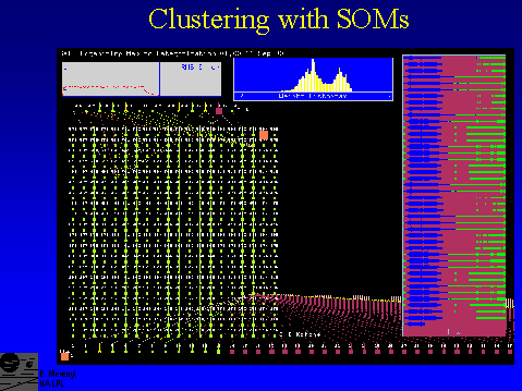 Clusters identified from a knowledge representation display of a 40 x 40 Self-Organizing Map (left), and the corresponding spatial regions (right). The input data set is the same 194-band, 140 Mbyte AVIRIS spectral image as in slide 6. The full spectral resolution was utilized in producing these 32 clusters, in an unsupervised procedure. Screen display is from the graphical user interface of the REMAP tool. Image material from Merényi et al, 1999c.