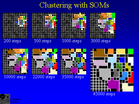 The spectral types are known to us, but not known to the SOM. During unsupervised training, the SOM learns to distinguish them and sorts them into separate clusters. The process is illustrated here. Data points of the same spectral type are colored the same, to see if the SOM clusters the data correctly. The white fences delineating the final clusters develop during the learning process. They are representing the difference of the weights of neighboring SOM neurons. The larger the difference, the more dissimilar the data that are mapped to the corresponding adjacent neurons. In this case, the SOM contains 15 x 15 neurons. Note that the fences completely disappeard within the final clusters, indicating strong similarity among data points within clusters. Image material from Merényi et al, 1999c.