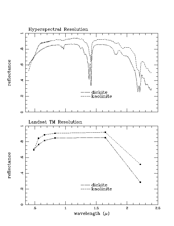 AVIRIS vs Landsat TM resolution of mineral spectral features. Note in particular that the "kaolinite doublet" (the asymmetric double absorption band) near 2.2 microns, which is the diagnostic signature of kaolinite, is superbly distinguishable from the symmetric doublet of dickite at hyperspectral resolution. (Spectra from the USGS SPECLAB library.)
