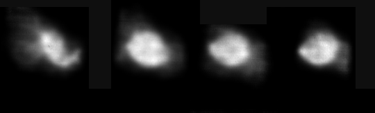 These are the four closest-to-encounter images of the nucleus of P/Halley, taken by the Soviet Vega-1 spacecraft, from distances between 9300 and 9800 km (= about 20 times the distance of the closest approach of the Giotto spacecraft). The near-encounter Vega-1 image sequence (64 frames) covers about 160 degrees viewing angle, which allowed the reconstruction of a 3-D model of the shape of the nucleus . The original images were distorted by noise and were severely out of focus because the camera slid from the focal plane due to a loosened screw. Restoration of these once-in-a-lifetime treasures was a labor of love. [Merényi, E. ,1996, "Processing of Near-Nucleus Vega Images." In Images of the Nucleus of Comet Halley, Eds. R. Reinhard and B. Battrick, ESA SP-1127, pp 53-60 and 85-230.] |