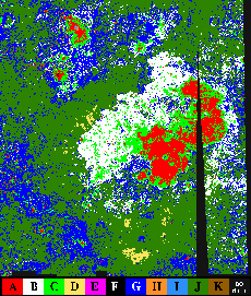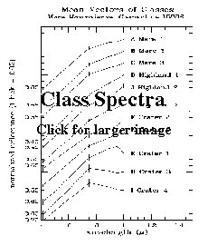 Spectral units in Mare Moscoviense, lunar farside, from 5-band UVVIS Clementine spectral image . The five image bands are at 0.415, 0.75, 0.9 0.95 and 1.0 microns. Average spectra of the classes shown in the class map at left.These spectra have been normalized to 1. at 1.0 micron. One standard deviation is indicated by the vertical bars. |