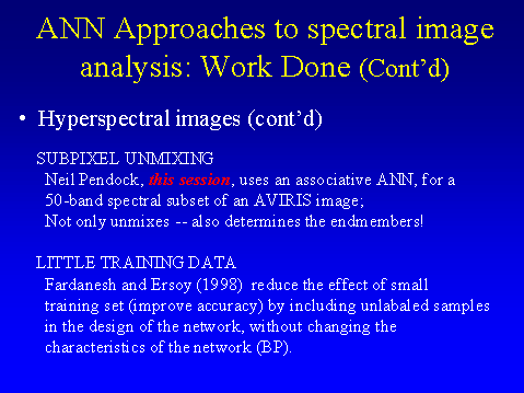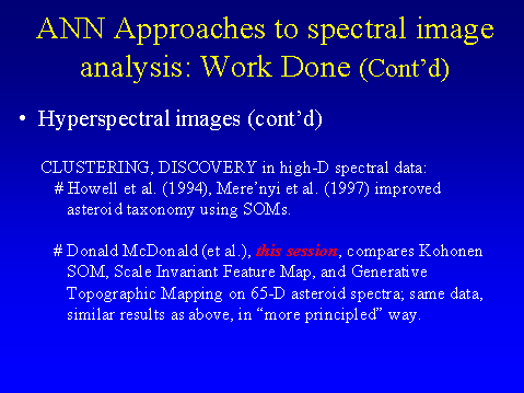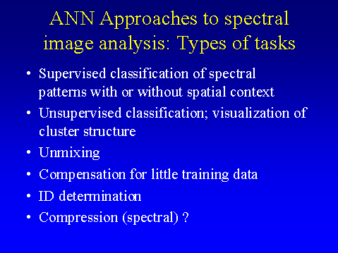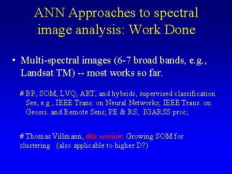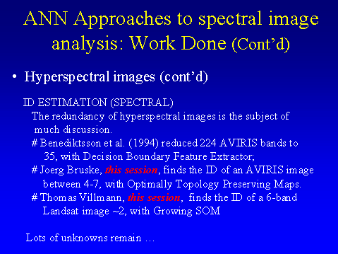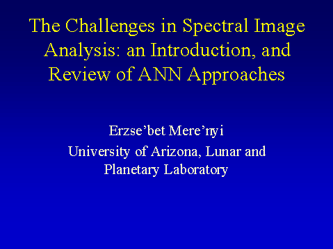 Slides of review talk " The Challenges in Spectral Image Analysis: an Introduction, and Review of ANN Approaches", introducing a special session on "Spectral Image analyses with ANNs", organized by E. Merényi, at ESANN'99, European Symposium on Artificial Neural Networks, Bruges, Belgium, April 21-23, 1999. See Paper for text and references.