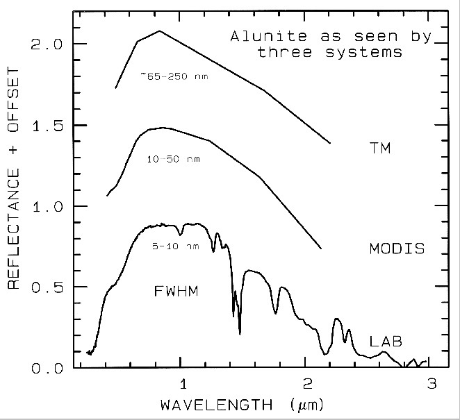 Another illustration of the difference between broad band multi-spectral and hyperspectral resolution of the spectral signatures of surface materials. From Clark, 1999.
