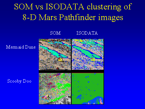 Example of the advantage of Self-Oragnizing Artificial Neural Net for clustering a spectral image. For more explanation of this slide see AISRP'99 Workshop presentation.