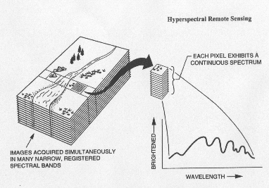 This illiustration shows the difference between the bandpasses of a broad band mutli-spectral imager, Landsat TM, and a hyperspectral scanner, AVIRIS. (Green and Simmonds, Summaries of the 4th JPL Airborne Geoscience Workshop, Pasadena, CA, 1993. R.O. Green Ed.)