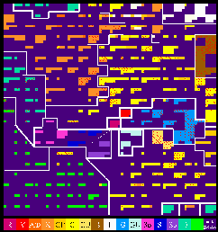 Figure at right: (Click on image for full view.) Cluster map of the same data as above, prepared by a Self-Organizing Artificial Neural Net. The clusters are separated by the white fences, the fence width indicates the measure of dissimilarity between groups. Here, all clusters can be seen in one 2-dimensional representation, clearly separated. Olivine rich (So) and pyroxene rich (Sp) subclasses of S asteroids, for example, were detected with this techniqe while formal identification eluded conventional methods such as PCA or minimum tree clustering. Figure and details in Merényi et al., Prediciton of water in asteroids from spectral data shortward of 3 microns, ICARUS, 129, pp 421-439, 1997. |
