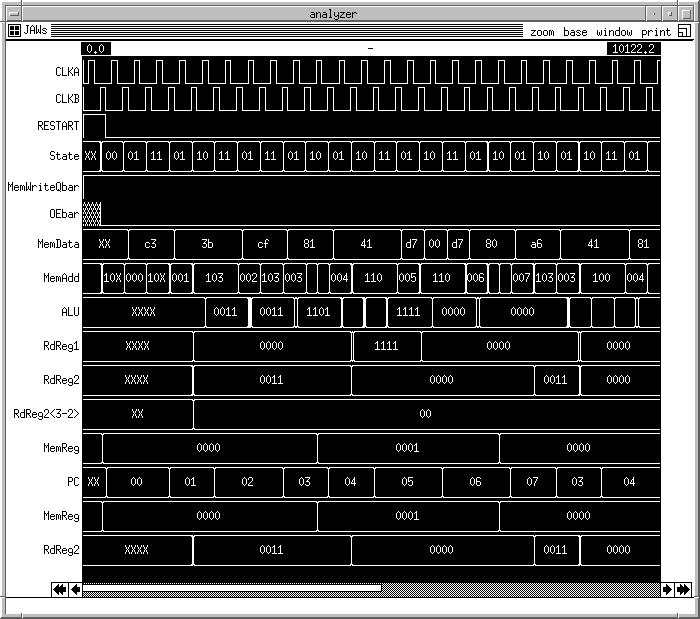 logfile cpu.log clock CLKA 0 1 0 0 clock CLKB 0 0 0 1 | pin vectors vector MemData MemData<7> MemData<6> MemData<5> MemData<4> MemData<3> MemData<2> MemData<1> MemData<0> vector MemAdd MemAdd<8> MemAdd<7> MemAdd<6> MemAdd<5> MemAdd<4> MemAdd<3> MemAdd<2> MemAdd<1> MemAdd<0> vector State StBit0 StBit1 vector RdReg1 RegA<3> RegA<2> RegA<1> RegA<0> vector RdReg2<3-2> RegB<3> RegB<2> vector ALU ALU<3> ALU<2> ALU<1> ALU<0> | core vectors vector PostMemData PostMemData<7> PostMemData<6> PostMemData<5> PostMemData<4> PostMemData<3> PostMemData<2> PostMemData<1> PostMemData<0> vector PC PC<7> PC<6> PC<5> PC<4> PC<3> PC<2> PC<1> PC<0> vector SelectedPC SelectedPC<7> SelectedPC<6> SelectedPC<5> SelectedPC<4> SelectedPC<3> SelectedPC<2> SelectedPC<1> SelectedPC<0> vector PCin PCin<7> PCin<6> PCin<5> PCin<4> PCin<3> PCin<2> PCin<1> PCin<0> vector PInF PInF<7> PInF<6> PInF<5> PInF<4> PInF<3> PInF<2> PInF<1> PInF<0> vector Add1in Add1in<7> Add1in<6> Add1in<5> Add1in<4> Add1in<3> Add1in<2> Add1in<1> Add1in<0> vector PAdd1 PAdd1<7> PAdd1<6> PAdd1<5> PAdd1<4> PAdd1<3> PAdd1<2> PAdd1<1> PAdd1<0> vector incPC incPC<7> incPC<6> incPC<5> incPC<4> incPC<3> incPC<2> incPC<1> incPC<0> vector PMRS PMRS<3> PMRS<2> PMRS<1> PMRS<0> vector MemReg RMDATA<3> RMDATA<2> RMDATA<1> RMDATA<0> vector intRegA intRegA<3> intRegA<2> intRegA<1> intRegA<0> vector RdReg2 intRegB<3> intRegB<2> intRegB<1> intRegB<0> vector PID PID<3> PID<2> PID<1> PID<0> vector PM2R PM2R<3> PM2R<2> PM2R<1> PM2R<0> vector MImm MImm<3> MImm<2> MImm<1> MImm<0> vector P4I P4I<3> P4I<2> P4I<1> P4I<0> vector PSrc2 PSrc2<3> PSrc2<2> PSrc2<1> PSrc2<0> vector PALU PALU<3> PALU<2> PALU<1> PALU<0> vector WBData WBData<3> WBData<2> WBData<1> WBData<0> vector PIR3 PIR3<1> PIR3<0> vector intState intStBit0 intStBit1 vector Ins Ins<7> Ins<6> Ins<5> Ins<4> Ins<3> Ins<2> Ins<1> Ins<0> | pin ana's ana CLKA CLKB Restart State MemWriteQbar OEbar MemData MemAdd ALU RdReg1 RdReg2 RdReg2<3-2> MemReg |ana intRestart |ana PostMemData |ana Ins |ana InF |ana intState |ana ClearRegs |ana ImpReg3 |ana FourImm |ana ALUSrc2 |ana RegWrite |ana Mem2Reg |ana ImmData |ana Branch |ana SetPC |ana RegRead |ana PCstore |ana PCstorebar ana PC |ana Add1in |ana EQZ GTZ |ana PBZ |ana PCSelect |ana PCin |ana PInF |ana PAdd1 |ana incPC |ana SelectedPC |ana PCin |ana PMRS ana MemReg |ana PALU |ana WBData |ana MImm |ana PM2R |ana PIR3 |ana intRegA ana RdReg2 |ana PID |ana PM2R |ana MImm |ana P4I |ana PSrc2 |ana PALU |ana WBData |ana PIR3 |ana Vdd |ana GND V RESTART 1 0 0 0 0 0 0 0 0 0 0 0 0 0 0 0 0 0 0 0 0 0 0 0 0 0 0 0 0 0 0 0 0 0 0 0 0 0 0 0 0 0 0 0 0 0 0 0 0 V MemData XXXXXXXX XXXXXXXX 11000011 11000011 00111011 00111011 00111011 11001111 11001111 10000001 10000001 01000001 01000001 01000001 1101 0111 00000000 11010111 10000000 10000000 10100110 10100110 01000001 01000001 01000001 10000001 10000001 11010111 00000000 11010111 10000000 100 00000 10100110 10100110 01000001 01000001 01000001 10000001 10000001 11010111 00001000 11010111 10000000 10000000 10100110 10100110 10011100 XX XXXXXX 00000000 00000000 R