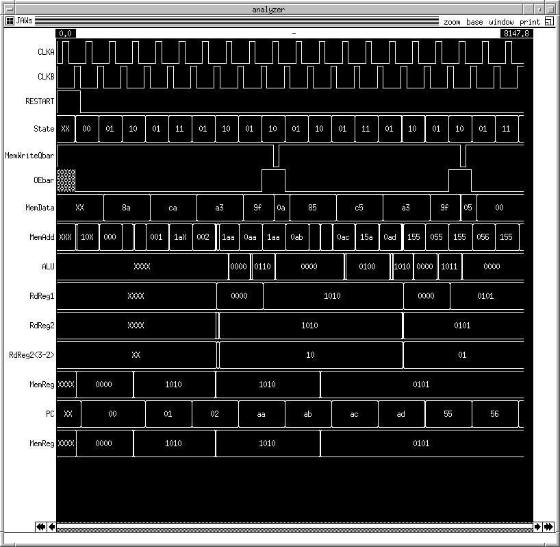 | This file is designed to verify that all bits are passed to the Instruction Fetch Mux correctly logfile cpu.log clock CLKA 0 1 0 0 clock CLKB 0 0 0 1 | pin vectors vector MemData MemData<7> MemData<6> MemData<5> MemData<4> MemData<3> MemData<2> MemData<1> MemData<0> vector MemAdd MemAdd<8> MemAdd<7> MemAdd<6> MemAdd<5> MemAdd<4> MemAdd<3> MemAdd<2> MemAdd<1> MemAdd<0> vector State StBit0 StBit1 vector RdReg1 RegA<3> RegA<2> RegA<1> RegA<0> vector RdReg2<3-2> RegB<3> RegB<2> vector ALU ALU<3> ALU<2> ALU<1> ALU<0> | core vectors vector PostMemData PostMemData<7> PostMemData<6> PostMemData<5> PostMemData<4> PostMemData<3> PostMemData<2> PostMemData<1> PostMemData<0> vector PC PC<7> PC<6> PC<5> PC<4> PC<3> PC<2> PC<1> PC<0> vector SelectedPC SelectedPC<7> SelectedPC<6> SelectedPC<5> SelectedPC<4> SelectedPC<3> SelectedPC<2> SelectedPC<1> SelectedPC<0> vector PCin PCin<7> PCin<6> PCin<5> PCin<4> PCin<3> PCin<2> PCin<1> PCin<0> vector PInF PInF<7> PInF<6> PInF<5> PInF<4> PInF<3> PInF<2> PInF<1> PInF<0> vector Add1in Add1in<7> Add1in<6> Add1in<5> Add1in<4> Add1in<3> Add1in<2> Add1in<1> Add1in<0> vector PAdd1 PAdd1<7> PAdd1<6> PAdd1<5> PAdd1<4> PAdd1<3> PAdd1<2> PAdd1<1> PAdd1<0> vector incPC incPC<7> incPC<6> incPC<5> incPC<4> incPC<3> incPC<2> incPC<1> incPC<0> vector PMRS PMRS<3> PMRS<2> PMRS<1> PMRS<0> vector MemReg RMDATA<3> RMDATA<2> RMDATA<1> RMDATA<0> vector intRegA intRegA<3> intRegA<2> intRegA<1> intRegA<0> vector RdReg2 intRegB<3> intRegB<2> intRegB<1> intRegB<0> vector PID PID<3> PID<2> PID<1> PID<0> vector PM2R PM2R<3> PM2R<2> PM2R<1> PM2R<0> vector MImm MImm<3> MImm<2> MImm<1> MImm<0> vector P4I P4I<3> P4I<2> P4I<1> P4I<0> vector PSrc2 PSrc2<3> PSrc2<2> PSrc2<1> PSrc2<0> vector PALU PALU<3> PALU<2> PALU<1> PALU<0> vector WBData WBData<3> WBData<2> WBData<1> WBData<0> vector PIR3 PIR3<1> PIR3<0> vector intState intStBit0 intStBit1 vector Ins Ins<7> Ins<6> Ins<5> Ins<4> Ins<3> Ins<2> Ins<1> Ins<0> | pin ana's ana CLKA CLKB Restart State MemWriteQbar OEbar MemData MemAdd ALU RdReg1 RdReg2 RdReg2<3-2> MemReg |ana intRestart |ana PostMemData |ana Ins |ana InF |ana intState |ana ClearRegs |ana ImpReg3 |ana FourImm |ana ALUSrc2 |ana RegWrite |ana Mem2Reg |ana ImmData |ana Branch |ana SetPC |ana RegRead |ana PCstore |ana PCstorebar ana PC |ana Add1in |ana EQZ GTZ |ana PBZ |ana PCSelect |ana PCin |ana PInF |ana PAdd1 |ana incPC |ana SelectedPC |ana PCin |ana PMRS ana MemReg |ana PALU |ana WBData |ana MImm |ana PM2R |ana PIR3 |ana intRegA |ana RdReg2 |ana PID |ana PM2R |ana MImm |ana P4I |ana PSrc2 |ana PALU |ana WBData |ana PIR3 |ana Vdd |ana GND #define ADDD 0101 #define ADDI 0100 #define SUB 0001 #define SLL 0111 #define NOT 0110 #define AND 0010 #define OR 0011 #define LW 1101 #define LDI 1100 #define SW 1001 #define SETMI 1000 #define BEZ 1010 #define BGZ 1011 #define NOOP 00000000 #define ZERO 1111 #define SETM 1110 #define HIZ XXXXXXXX V RESTART 1 0 0 0 0 0 0 0 0 0 0 0 0 0 0 0 0 0 0 0 V MemData HIZ HIZ SETMI1010 HIZ LDI1010 HIZ BEZ0011 HIZ SW1111 HIZ SETMI0101 HIZ LDI0101 HIZ BEZ0011 HIZ SW1111 HIZ NOOP HIZ R