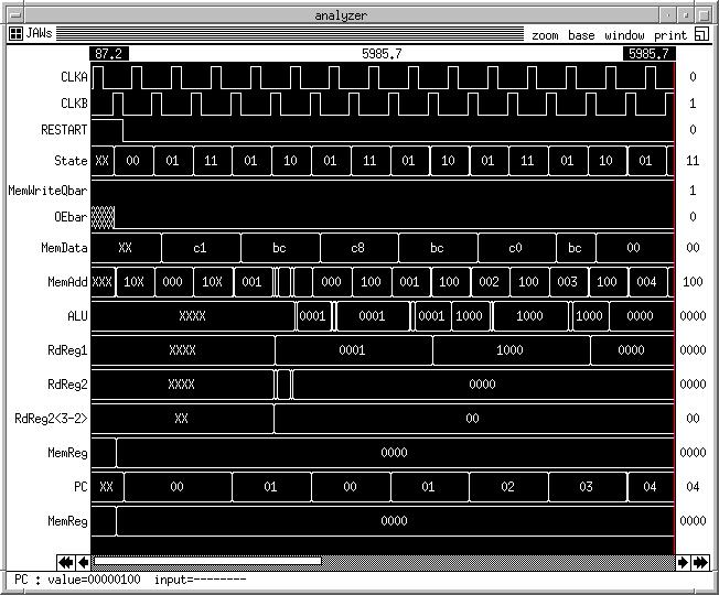 ana CLKA CLKB Restart State MemWriteQbar OEbar MemData MemAdd ALU RdReg1 RdReg2 RdReg2<3-2> MemReg