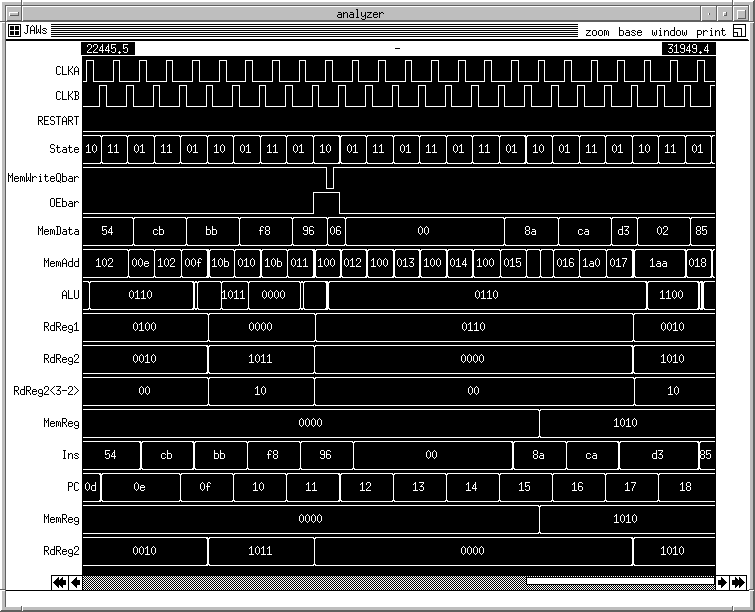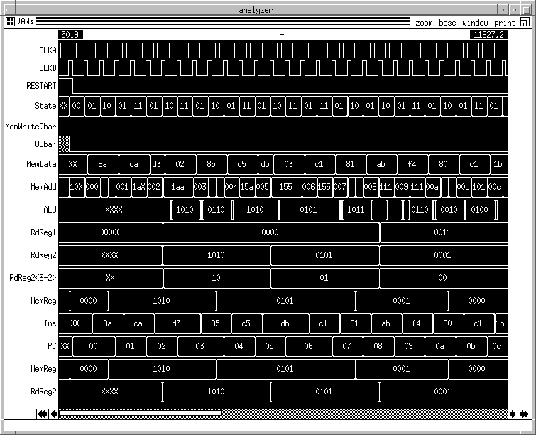 logfile cpu.log clock CLKA 0 1 0 0 clock CLKB 0 0 0 1 | pin vectors vector MemData MemData<7> MemData<6> MemData<5> MemData<4> MemData<3> MemData<2> MemData<1> MemData<0> vector MemAdd MemAdd<8> MemAdd<7> MemAdd<6> MemAdd<5> MemAdd<4> MemAdd<3> MemAdd<2> MemAdd<1> MemAdd<0> vector State StBit0 StBit1 vector RdReg1 RegA<3> RegA<2> RegA<1> RegA<0> vector RdReg2<3-2> RegB<3> RegB<2> vector ALU ALU<3> ALU<2> ALU<1> ALU<0> | core vectors vector PostMemData PostMemData<7> PostMemData<6> PostMemData<5> PostMemData<4> PostMemData<3> PostMemData<2> PostMemData<1> PostMemData<0> vector PC PC<7> PC<6> PC<5> PC<4> PC<3> PC<2> PC<1> PC<0> vector SelectedPC SelectedPC<7> SelectedPC<6> SelectedPC<5> SelectedPC<4> SelectedPC<3> SelectedPC<2> SelectedPC<1> SelectedPC<0> vector PCin PCin<7> PCin<6> PCin<5> PCin<4> PCin<3> PCin<2> PCin<1> PCin<0> vector PInF PInF<7> PInF<6> PInF<5> PInF<4> PInF<3> PInF<2> PInF<1> PInF<0> vector Add1in Add1in<7> Add1in<6> Add1in<5> Add1in<4> Add1in<3> Add1in<2> Add1in<1> Add1in<0> vector PAdd1 PAdd1<7> PAdd1<6> PAdd1<5> PAdd1<4> PAdd1<3> PAdd1<2> PAdd1<1> PAdd1<0> vector incPC incPC<7> incPC<6> incPC<5> incPC<4> incPC<3> incPC<2> incPC<1> incPC<0> vector PMRS PMRS<3> PMRS<2> PMRS<1> PMRS<0> vector MemReg RMDATA<3> RMDATA<2> RMDATA<1> RMDATA<0> vector intRegA intRegA<3> intRegA<2> intRegA<1> intRegA<0> vector RdReg2 intRegB<3> intRegB<2> intRegB<1> intRegB<0> vector PID PID<3> PID<2> PID<1> PID<0> vector PM2R PM2R<3> PM2R<2> PM2R<1> PM2R<0> vector MImm MImm<3> MImm<2> MImm<1> MImm<0> vector P4I P4I<3> P4I<2> P4I<1> P4I<0> vector PSrc2 PSrc2<3> PSrc2<2> PSrc2<1> PSrc2<0> vector PALU PALU<3> PALU<2> PALU<1> PALU<0> vector WBData WBData<3> WBData<2> WBData<1> WBData<0> vector PIR3 PIR3<1> PIR3<0> vector intState intStBit0 intStBit1 vector Ins Ins<7> Ins<6> Ins<5> Ins<4> Ins<3> Ins<2> Ins<1> Ins<0> | pin ana's ana CLKA CLKB Restart State MemWriteQbar OEbar MemData MemAdd ALU RdReg1 RdReg2 RdReg2<3-2> MemReg |ana intRestart |ana PostMemData ana Ins |ana InF |ana intState |ana ClearRegs |ana ImpReg3 |ana FourImm |ana ALUSrc2 |ana RegWrite |ana Mem2Reg |ana ImmData |ana Branch |ana SetPC |ana RegRead |ana PCstore |ana PCstorebar ana PC |ana Add1in |ana EQZ GTZ |ana PBZ |ana PCSelect |ana PCin |ana PInF |ana PAdd1 |ana incPC |ana SelectedPC |ana PCin |ana PMRS ana MemReg |ana PALU |ana WBData |ana MImm |ana PM2R |ana PIR3 |ana intRegA ana RdReg2 |ana PID |ana PM2R |ana MImm |ana P4I |ana PSrc2 |ana PALU |ana WBData |ana PIR3 |ana Vdd |ana GND V RESTART 1 0 0 0 0 0 0 0 0 0 0 0 0 0 0 0 0 0 0 0 0 0 0 0 0 0 0 0 0 0 0 0 0 0 0 0 0 0 0 0 0 0 0 0 0 0 0 0 0 0 0 0 0 0 0 0 0 0 0 0 0 0 0 0 0 0 0 0 0 0 0 0 0 0 0 0 0 0 0 0 V MemData HIZ HIZ SETMI1010 HIZ LDI1010 HIZ LW0011 00000010 HIZ SETMI0101 HIZ LDI0101 HIZ LW1011 00000011 HIZ LDI0001 HIZ SETMI0001 HIZ BEZ1011 H IZ ZERO0100 HIZ SETMI0000 HIZ LDI0001 HIZ SUB1011 HIZ HIZ ADDD0100 HIZ HIZ LDI1011 HIZ BGZ1011 HIZ LDI0001 HIZ SUB1011 HIZ HIZ ADDD0100 HIZ HIZ LDI 1011 HIZ BGZ1011 HIZ LDI0001 HIZ SUB1011 HIZ HIZ ADDD0100 HIZ HIZ LDI1011 HIZ BGZ1011 HIZ ZERO1000 HIZ SW0110 HIZ NOOP NOOP NOOP NOOP R