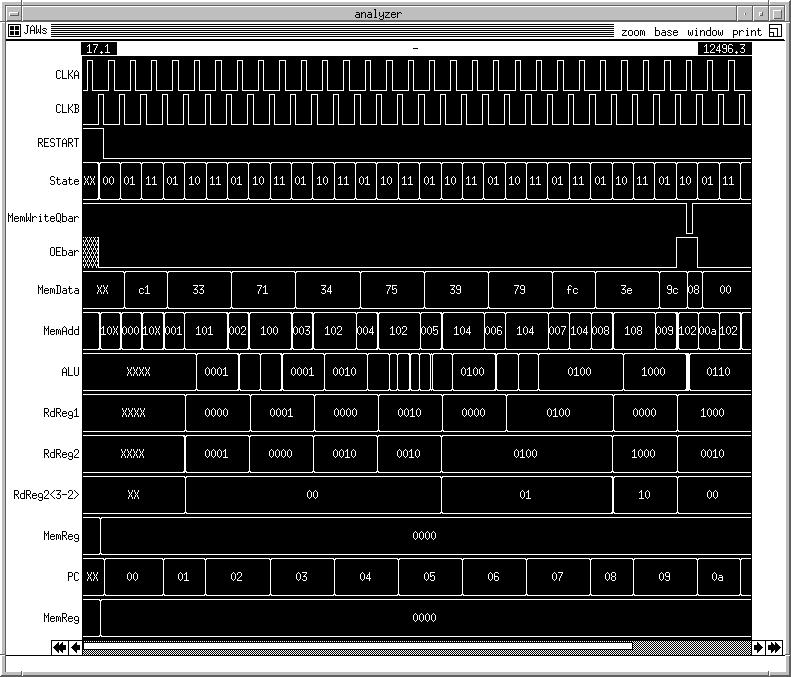 | This file is designed to verify that the registers can all be accessed and written to. The file verifies that the read and writeback | paths function properly for all logic values. | Also shows that ImpReg3 passes all logic values correctly. | Verifies the latches in the register read and writeback paths. logfile cpu.log clock CLKA 0 1 0 0 clock CLKB 0 0 0 1 | pin vectors vector MemData MemData<7> MemData<6> MemData<5> MemData<4> MemData<3> MemData<2> MemData<1> MemData<0> vector MemAdd MemAdd<8> MemAdd<7> MemAdd<6> MemAdd<5> MemAdd<4> MemAdd<3> MemAdd<2> MemAdd<1> MemAdd<0> vector State StBit0 StBit1 vector RdReg1 RegA<3> RegA<2> RegA<1> RegA<0> vector RdReg2<3-2> RegB<3> RegB<2> vector ALU ALU<3> ALU<2> ALU<1> ALU<0> | core vectors vector PostMemData PostMemData<7> PostMemData<6> PostMemData<5> PostMemData<4> PostMemData<3> PostMemData<2> PostMemData<1> PostMemData<0> vector PC PC<7> PC<6> PC<5> PC<4> PC<3> PC<2> PC<1> PC<0> vector SelectedPC SelectedPC<7> SelectedPC<6> SelectedPC<5> SelectedPC<4> SelectedPC<3> SelectedPC<2> SelectedPC<1> SelectedPC<0> vector PCin PCin<7> PCin<6> PCin<5> PCin<4> PCin<3> PCin<2> PCin<1> PCin<0> vector PInF PInF<7> PInF<6> PInF<5> PInF<4> PInF<3> PInF<2> PInF<1> PInF<0> vector Add1in Add1in<7> Add1in<6> Add1in<5> Add1in<4> Add1in<3> Add1in<2> Add1in<1> Add1in<0> vector PAdd1 PAdd1<7> PAdd1<6> PAdd1<5> PAdd1<4> PAdd1<3> PAdd1<2> PAdd1<1> PAdd1<0> vector incPC incPC<7> incPC<6> incPC<5> incPC<4> incPC<3> incPC<2> incPC<1> incPC<0> vector PMRS PMRS<3> PMRS<2> PMRS<1> PMRS<0> vector MemReg RMDATA<3> RMDATA<2> RMDATA<1> RMDATA<0> vector intRegA intRegA<3> intRegA<2> intRegA<1> intRegA<0> vector RdReg2 intRegB<3> intRegB<2> intRegB<1> intRegB<0> vector PID PID<3> PID<2> PID<1> PID<0> vector PM2R PM2R<3> PM2R<2> PM2R<1> PM2R<0> vector MImm MImm<3> MImm<2> MImm<1> MImm<0> vector P4I P4I<3> P4I<2> P4I<1> P4I<0> vector PSrc2 PSrc2<3> PSrc2<2> PSrc2<1> PSrc2<0> vector PALU PALU<3> PALU<2> PALU<1> PALU<0> vector WBData WBData<3> WBData<2> WBData<1> WBData<0> vector PIR3 PIR3<1> PIR3<0> vector intState intStBit0 intStBit1 vector Ins Ins<7> Ins<6> Ins<5> Ins<4> Ins<3> Ins<2> Ins<1> Ins<0> | pin ana's ana CLKA CLKB Restart State MemWriteQbar OEbar MemData MemAdd ALU RdReg1 RdReg2 RdReg2<3-2> MemReg |ana intRestart |ana PostMemData |ana Ins |ana InF |ana intState |ana ClearRegs |ana ImpReg3 |ana FourImm |ana ALUSrc2 |ana RegWrite |ana Mem2Reg |ana ImmData |ana Branch |ana SetPC |ana RegRead |ana PCstore |ana PCstorebar ana PC |ana Add1in |ana EQZ GTZ |ana PBZ |ana PCSelect |ana PCin |ana PInF |ana PAdd1 |ana incPC |ana SelectedPC |ana PCin |ana PMRS ana MemReg |ana PALU |ana WBData |ana MImm |ana PM2R |ana PIR3 |ana intRegA |ana RdReg2 |ana PID |ana PM2R |ana MImm |ana P4I |ana PSrc2 |ana PALU |ana WBData |ana PIR3 |ana Vdd |ana GND #define ADDD 0101 #define ADDI 0100 #define SUB 0001 #define SLL 0111 #define NOT 0110 #define AND 0010 #define OR 0011 #define LW 1101 #define LDI 1100 #define SW 1001 #define SETMI 1000 #define BEZ 1010 #define BGZ 1011 #define NOOP 00000000 #define ZERO 1111 #define SETM 1110 #define HIZ XXXXXXXX V RESTART 1 0 0 0 0 0 0 0 0 0 0 0 0 0 0 0 0 0 0 0 0 0 0 0 0 0 0 0 0 0 0 0 0 0 0 0 0 0 V MemData HIZ HIZ LDI0001 HIZ OR0011 HIZ HIZ SLL0001 HIZ HIZ OR0100 HIZ HIZ SLL0101 HIZ HIZ OR1001 HIZ HIZ SLL1001 HIZ HIZ ZERO1100 HIZ OR1110 HIZ HIZ SW1100 HIZ NOOP HIZ R