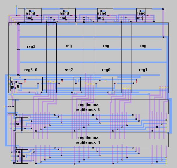 Subcells: 4-bit register (reg) 4-input, 4-bit mux (regfilemux) Inverter (invert, inverter_1input) 2-input NAND (2nand) 2-input NOR (2nor) Back to JAWs Cell Hierarchy