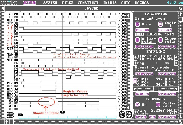 Before we connected our SRAM, we tested our CPU using our IRSIM vectors from last semester (i.e.