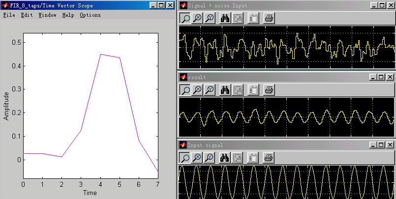 Figure 5.4 below depicts the results from running the simulation model shown above with a white noise input signal and a sine wave input signal. The topmost graph on the right labeled Signal + noise input is the desired signal and the middle graph on the right is the error output or result of the filter. As you can see, the noise has been almost completely cancelled and the output signal is similar to the input sine wave. The large graph on the left shows the value of each of the 8 weights after convergence ( ~ 600 iterations). As you can see, the values for each of the weights are never larger than 0.5 and never drops below -0.5. In addition to the simulation results shown below, we have simulated our system with variations on the noise input and have not seen any problems. We have not yet simulated our system with an actual voice and noise input because the version of MatLab on UNIX only supports this in Windows, and we have not been able to obtain a copy of MatLab to run in Windows with this feature. As soon as we get a version with this feature or another program that has this feature we will perform this simulation with real input signals.