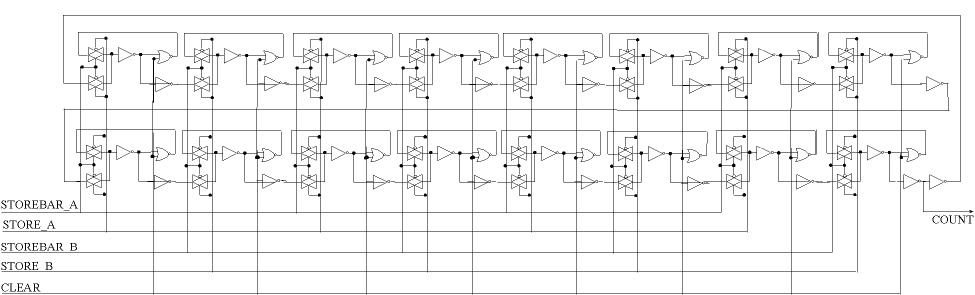 The logic diagram for the ring counter is shown below. It is essentially a ring oscillator whose COUNT value changes every 8 cycles of both the STORE_A and STORE_B qualified signals. It is constructed with 16 latches in series, alternating the STORE_A and STORE_B signals to control them. The output of the final latch is inverted and sent back to the input of the first latch. The CLEAR signal is used to clear all of the latches to 0 in order to start a count. Thus, the inverter will invert the input of the first latch to 1 and it will take 8 COUNT cycles for the 1 to reach the COUNT output at the input of the inverter. We use two counters in our system in conjunction with the PLA. The first is used to count the number of clock cycles for the multiplier and STORE_A and STORE_B are simply the CLKA and CLKB signals. The second is used to count the number of multiply operations that have been performed, thus it must be controlled using two signals from the PLA in order to increment the count every time a multiply operation is started. Since the two signals cannot be high simultaneously and it is not necessary for the count to be immediately updated in the same cycle, the PLA sends the two signals on two different cycles.