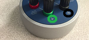 Temporarily turn off the supply. Using banana plug patch cables, connect the \(-25V\) terminal to the black binding post on your breadboard and the \(+25V\) terminal to the red breadboard binding post. To make a ground connection, connect the common terminal (circled in black) to the ground terminal (circled in green) with a banana plug patch cable. Use a second banana plug patch cable to connect the common terminal to the green breadboard binding post.