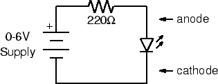 Using a 220-ohm (red-red-brown) resistor and your red LED, wire the following circuit: