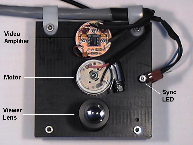 The camera is built around a large block of Delrin with the disk inside (shielded from ambient light) and all the various assemblies mounted to the outside. On the front are the camera lens and the viewer LED.