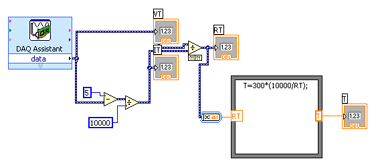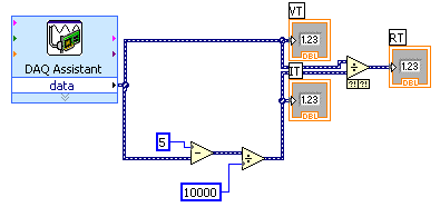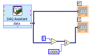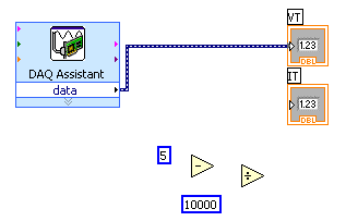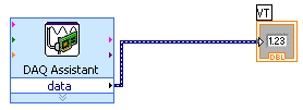 Place the cursor over the small black triangle in the "data" field of the DAQ Assistant block. It should change into an icon representing a small spool of wire. Left click once and move the cursor to the small white triangle in the center of the left edge of the numeric indicator icon and left click once more. That completes our first Labview program. It should look something like this: