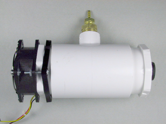 In order to build up a pressure we need to confine the output of the fan to a reasonably small volume. To facilitate this we have assembled a pressure control assembly from space-age plastic components. The fan assembly from the previous Experiment conveniently slips into one end of the structure, and the vinyl hose from the pressure sensor fits onto the barbed fitting in the center.