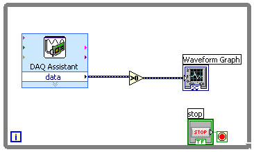 The block diagram is somewhat more interesting. We can see the icons corresponding to the input and output terminals, but the main feature is the strange looking block containing the functional blocks. This is a for loop.
