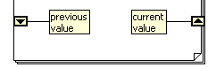 When a signal passes between the outside and inside of a block, the point of penetration is called a tunnel, denoted by the small square on the border of the block. When an input (or output) to a for loop is a vector, it exhibits a useful property called auto-indexing. In this case, the loop limit (N) is taken from the dimension of the vector, and on the inside of the loop, the value of each signal is the i-th component (a scalar) rather than the entire vector. This allows us to do point-by-point operations on a vector. Another useful property of a for loop is the ability to pass a value from one iteration of the loop to the next. This is done by using a shift register, denoted by a small rectangle with an upward pointing arrow on the right hand border and a corresponding node with a downward pointing arrow on the left border.