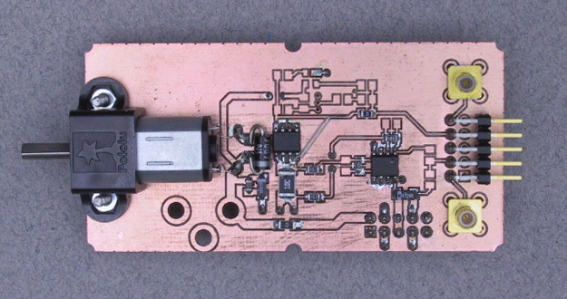 Design and layout a motor driver module that will replace the one used in the previous section of this exercise. Your design should utilize the Rohm BD6621 H-bridge driver chip. It should use the same form factor as the existing board and connect to the CPU module using the same interface. You need not provide current monitoring, nor the two SMB connectors which interface to the potentiometer and the scope. The function of the SMB connectors will be provided by the new SMB feedthru module. You do not need to provide for external power, use the +15 V breadboard supply (which will be set to 7.5 V). A board outline file (BRD2x1d.brd) is available in this week's zip file. You should provide for mounting a Pololu Micro Metal Gearmotor on the left hand side of the board, with the shaft overhanging the edge, as shown in the photograph below: