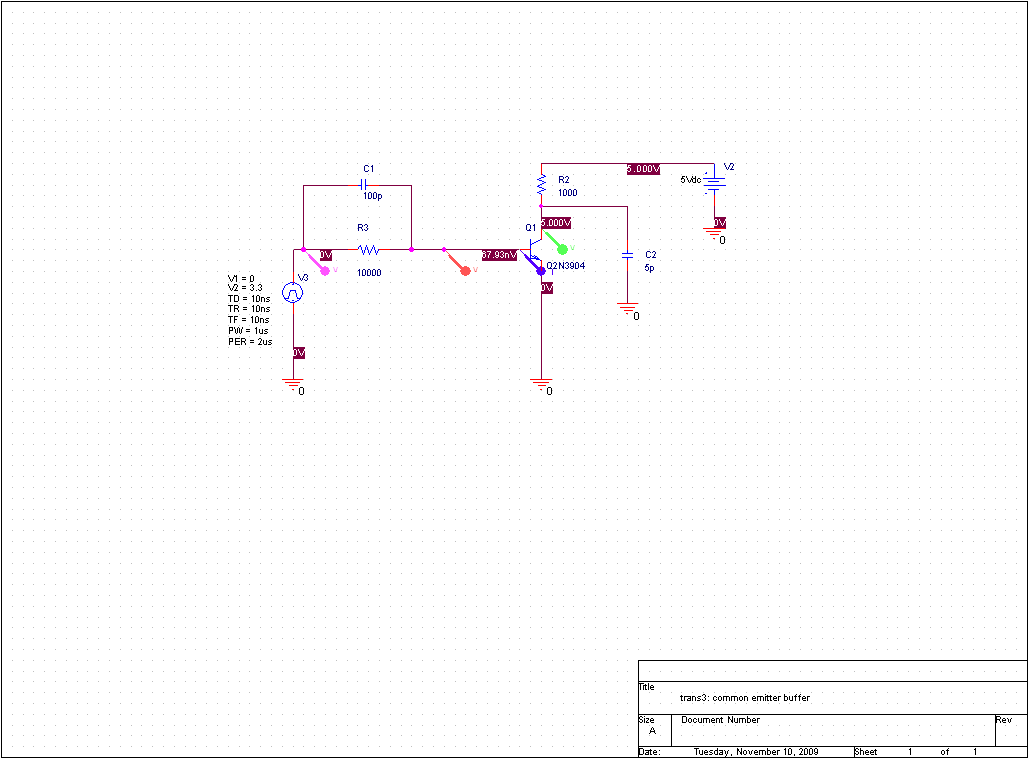 However, as with PCB layout, there are a number of unobvious options that need to be set, so it's best to start with a working project and modify it rather than start from scratch. Extract the lab9 directory from this week's zip file. Select Open->Project ... from the File menu, navigate to the lab9 directory that you extracted from the zip file, and open the trans3.opj file. You should see the following schematic: