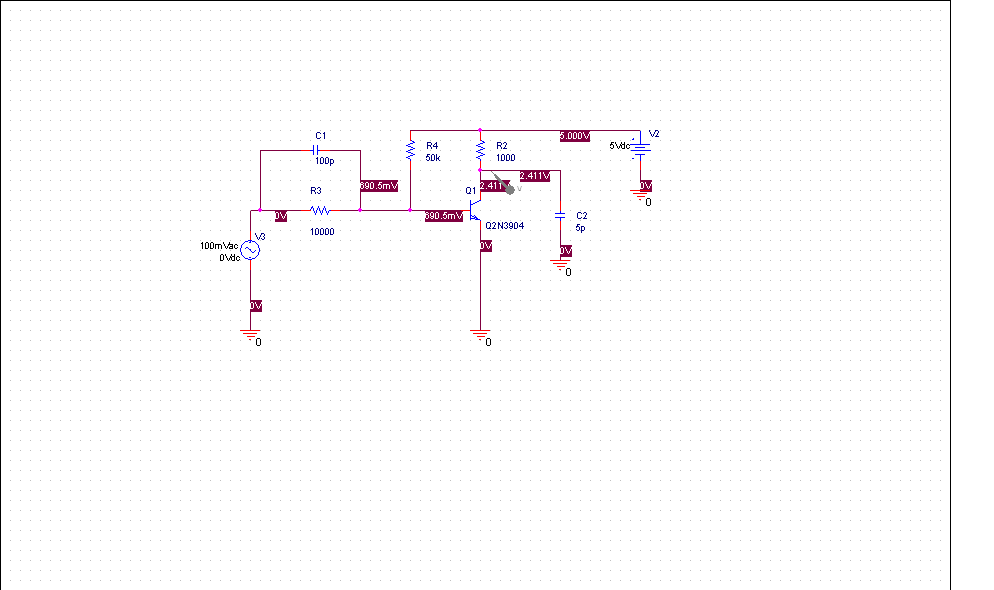 Spice can also be used to perform frequency domain simulation. There are two ways of doing this. One is to take the Fourier transform of the time domain transient response. (Try pushing the FFT button in the Pspice display window.) The other is to measure the steady state response to a sine wave of varying frequency (as in 241 lab). The latter measurement is performed using a linearized, small-signal model of the circuit, so we can't use it to see what our level shifter is doing in the frequency domain. However, we can use it to see what our level shifter would do in the frequency domain if it were biased to operate in the linear region of its transfer characteristic. We can do this by adding a single resistor, as shown in the circuit below.