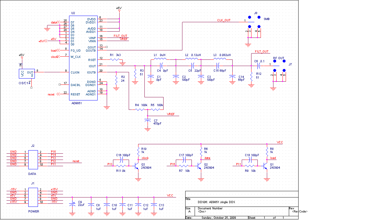 Like many of the chips we've used this semester, the AD9851 isn't very useful without a microprocessor to control it. Another similarity is that once we have added the microprocessor, very few additional components are required to get it to do useful work.