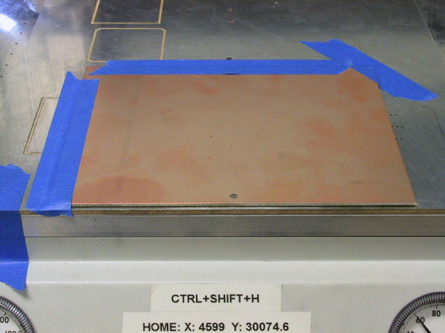 | Turn off the spindle, and move the machine head away from the cut, either with the jog panel, or by selecting Material Change from the menu. Brush the dust away from the cut and carefully examine it to insure that it has completely penetrated the copper and there is adequate space between the two edges. | ||||