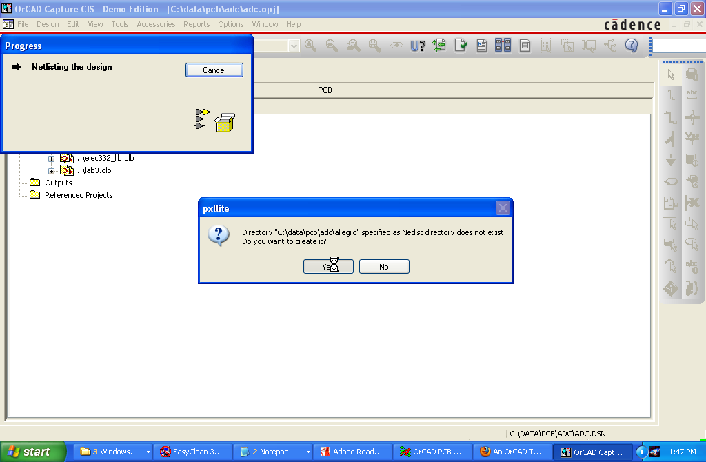 | After all the warnings about things that are supposed to happen, there's no indication of a successful conclusion. If things go badly wrong, you will get an error message. For details, you can reenable the session log by clicking its box in the Window menu. Alternately, an explanation of what went wrong will be in the file <home>/pcb/adc/allegro/netlist.log | ||||
