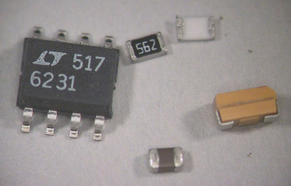 The value code on a surface mount resistor is the same as that on a leaded resistor, except that numerals are used rather than colored bands. For example, the "562" code on the resistor above denotes 56x102 or 5600 ohms. Electrolytic capacitors use the same code with the value in pF, so your 22 µF capacitor should be labeled "226". Ceramic capacitors are unlabeled.