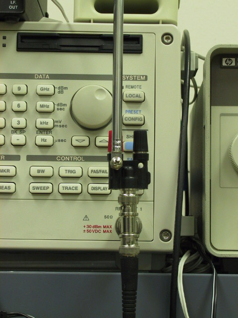 Connect the RF output to the scope, the spectrum analyzer, and a whip antenna.
