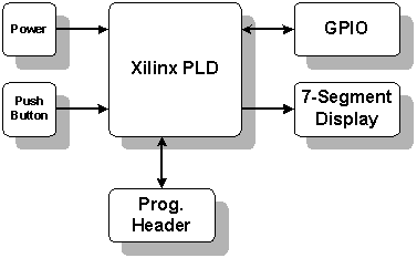 The circuit you will design is shown in the figure below. The main component is a programmable logic device (PLD) from Xilinx. PLDs, as the name implies, are programmable devices that can be used for a variety of useful tasks, and it is useful to be familiar with using them. In this circuit, we will use the PLD to light up a 7-segment LED display that will be used as a counter. Also in the circuit: a power connector for a 9-volt battery, a header for general purpose IO, a pushbutton switch, a programming interface for the PLD, and some miscellaneous resistors and capacitors.