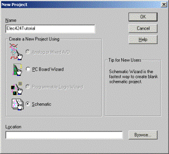 To create a new project, first start OrCAD Capture and click FileàNewàProject. You will see the following dialog box.