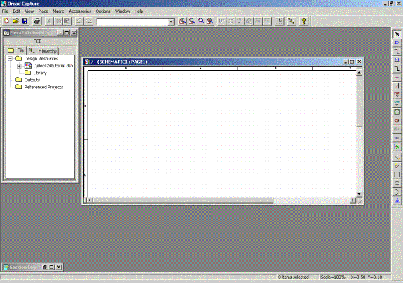 Browse to the sch directory that you created and name the project Elec424Tutorial. You now have an empty project workspace. You should see an empty schematic page and a project window like the following.